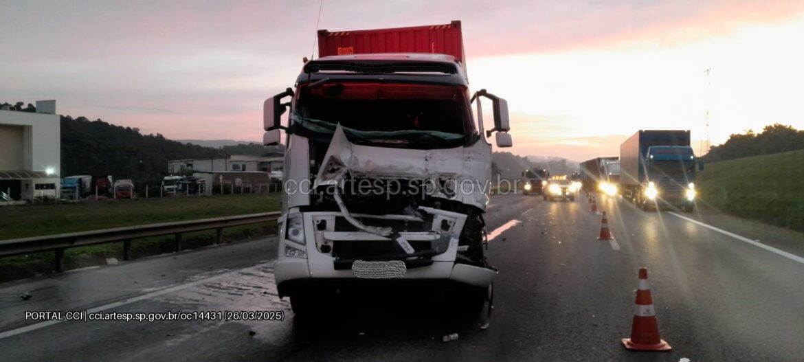 De acordo com a Artesp, os dois veículos seguiam sentido interior quando um bateu na traseira do outro. Uma das carretas ficou no acostamento, mas a outra ocupou a faixa dois, causando trânsito do km 58 ao 66.