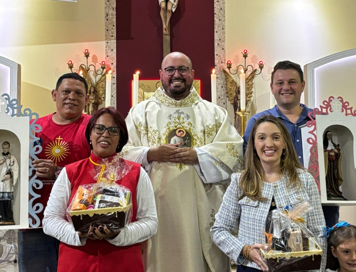 Os casais Aldrigo Veronezi Lima Prestes e Renata Santucci Prestes e Madson Roberto dos Santos e Patricia Candido dos Santos foram apresentados como responsáveis pelas festividades no ciclo 2025/2026. A comunidade parabenizou a nomeação com entusiasmo, desejando uma caminhada de fé e alegria aos novos festeiros.
