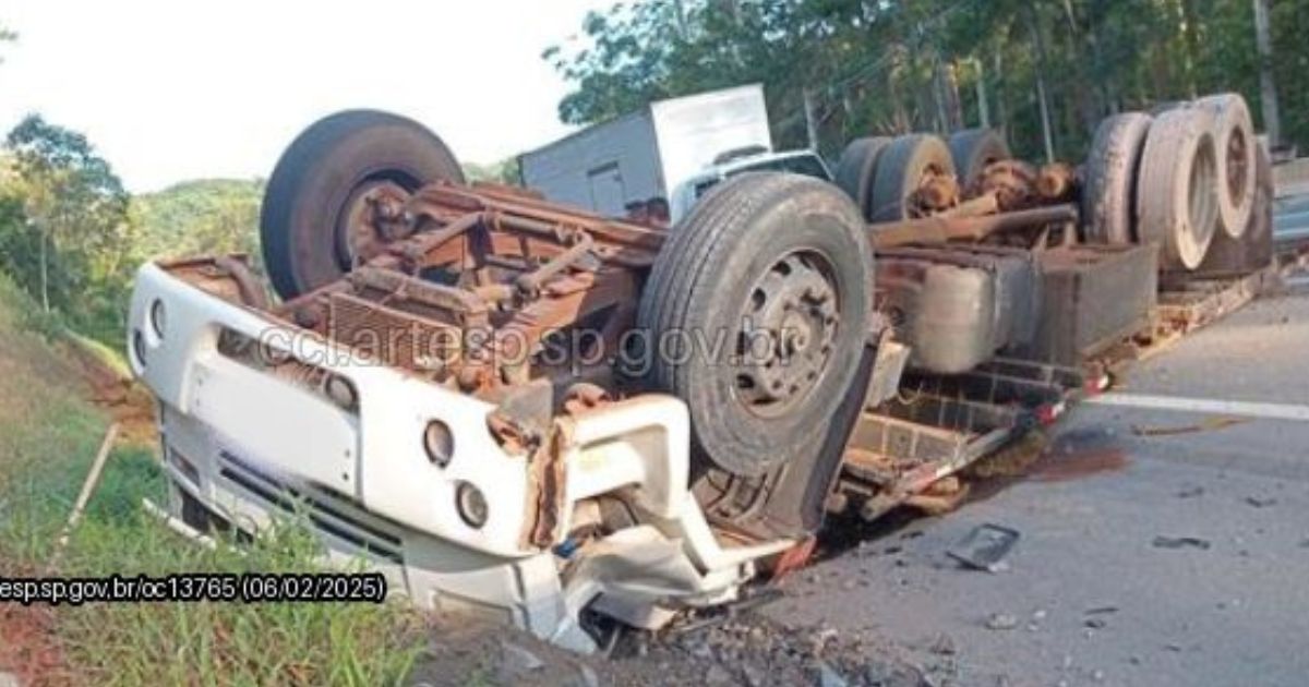 O condutor perdeu o controle da direção, resultando no tombamento do caminhão.