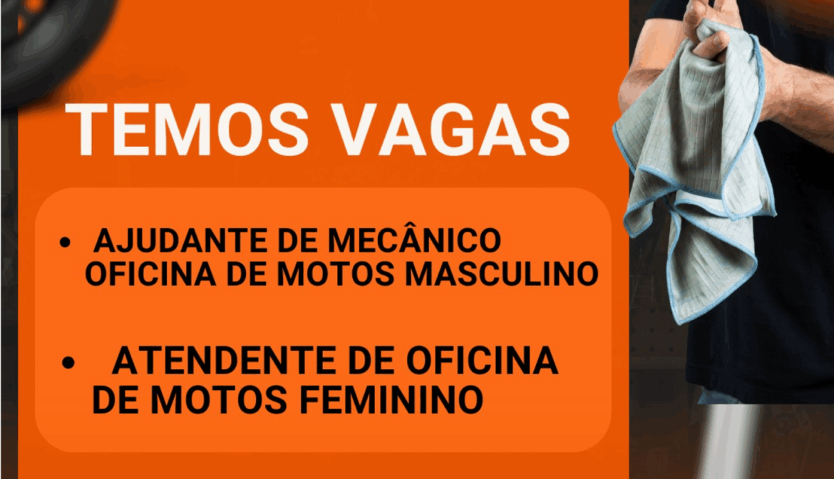 Uma oficina de motos está com vagas abertas para duas funções: ajudante de mecânico (preferencialmente do sexo masculino) e atendente de oficina (preferencialmente do sexo feminino). As oportunidades visam reforçar a equipe e oferecer um atendimento ainda mais qualificado aos clientes.
