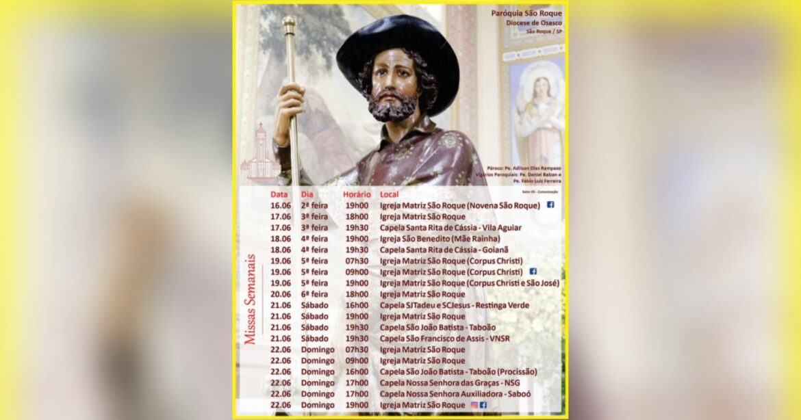 A Paróquia São Roque divulgou a programação de missas para a semana de 16 a 22 de junho. Com celebrações distribuídas entre a Igreja Matriz e diversas capelas da cidade celebrando a Novena de São Roque e Corpus Christi, além de procissões.